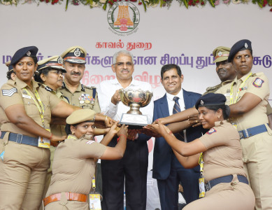 சென்னை, எழும்பூர், ராஜரத்தினம் விளையாட்டு அரங்கில் தமிழ்நாடு காவல்துறை சார்பில் நடைபெற்ற 'அகில இந்திய மகளிர் காவலர்களுக்கான சிறப்பு துப்பாக்கி சுடும் போட்டி' நிறைவு விழாவில் தலைமைச் செயலாளர் சிவ்தாஸ் மீனா, இ.ஆ.ப. அனைத்து பிரிவுகளிலும் பதக்கங்களை வென்ற தமிழ்நாடு மகளிர் காவலர் அணிக்கு ஒட்டு மொத்த சாம்பியன் கோப்பையை வழங்கினார்.