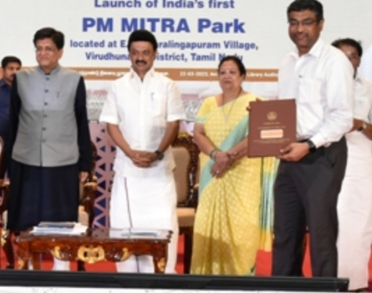 MOU for the launch of India's first Prime Minister's Integrated Textile Zone and Garment Park (PM MITRA) at E. Kumaralingapuram, Virudhunagar District, in the presence of M. K. Stalin and Union Minister of Commerce and Industry, Piyush Goyal (22.3.2023) at the Anna Centenary Memorial Library Hall, Chennai. Agreements were entered into between the Government of Tamil Nadu and the Union Government.