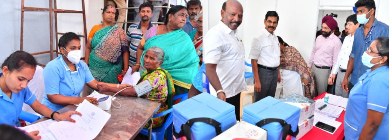 சென்னை, மெரினா கடற்கரை லூப் சாலை, டூமிங் குப்பத்தில், மருத்துவம் மற்றும் மக்கள் நல்வாழ்வுத் துறை சார்பில், மருத்துவம் மற்றும் மக்கள் நல்வாழ்வுத் துறை அமைச்சர் . அவர்கள், தலைமைச் செயலாளர் அவர்கள் ஆகியோர் முதலமைச்சரின் விரிவான மருத்துவ காப்பீட்டுத் திட்டத்தின் கீழ் நடைபெறும் சிறப்பு மருத்துவ முகாம் மற்றும் காப்பீட்டுத் திட்ட பயனாளிகள் பதிவு செய்யும் முகாமினை தொடங்கிவைத்து பார்வையிட்டார்கள். இந்த நிகழ்வின்போது, சட்ட மன்ற உறுப்பினர் .த.வேலு, பெருநகர சென்னை மாநகராட்சி ஆணையர்/ கூடுதல் தலைமைச் செயலாளர் மரு.ஜெ.ராதாகிருஷ்ணன், இ.ஆ.ப., மருத்துவம் மற்றும் மக்கள் நல்வாழ்வுத் துறை முதன்மைச் செயலாளர் .ககன்தீப் சிங் பேடி, இ.ஆ.ப., வீட்டுவசதி மற்றும் நகர்ப்புற வளர்ச்சித் துறை முதன்மைச் செயலாளர் செல்வி அபூர்வா,இ.ஆ.ப., தேசிய நலவாழ்வுக் குழும இயக்குநர் ஷில்பா பிரபாகர் சதீஷ், இ.ஆ.ப., தமிழ்நாடு சுகாதார அமைப்பு திட்ட இயக்குநர் திரு.கோவிந் ராவ், இ.ஆ.ப. மற்றும் அரசு உயர் அலுவலர்கள் உடனிருந்தனர்.